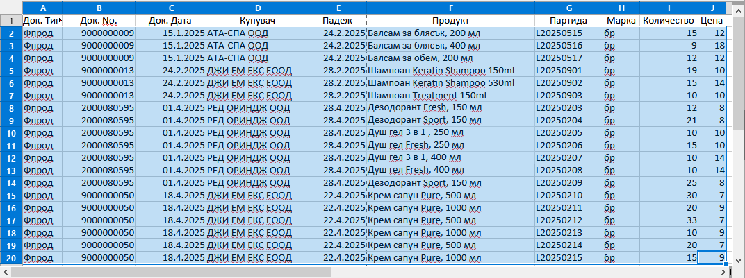 За да използвате предимството на импорта, предварително трябва да форматирате данните в Excel файл. Колоните във файла трябва да следват същата подредба, както колоните от формата на импорта.
