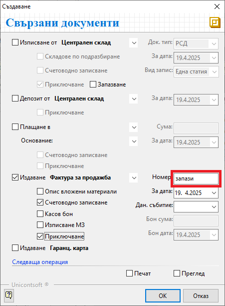 Ако полето остане празно, системата ще обзаведе документите с поредни номера спрямо настройките в Номератори.